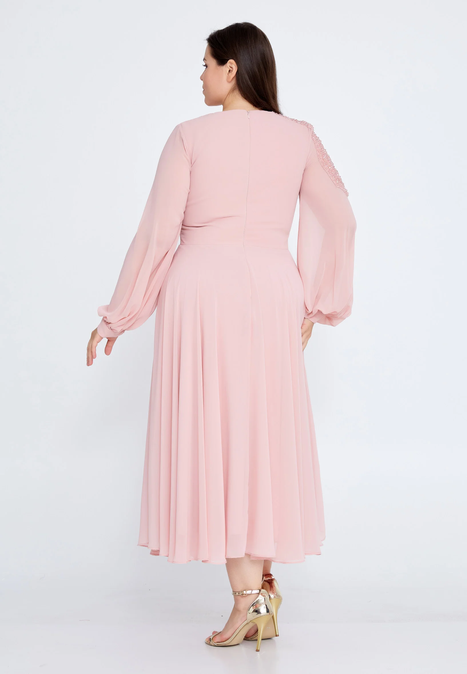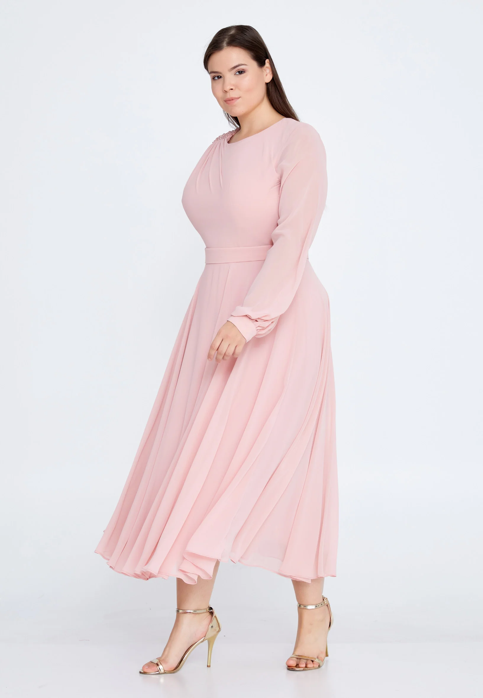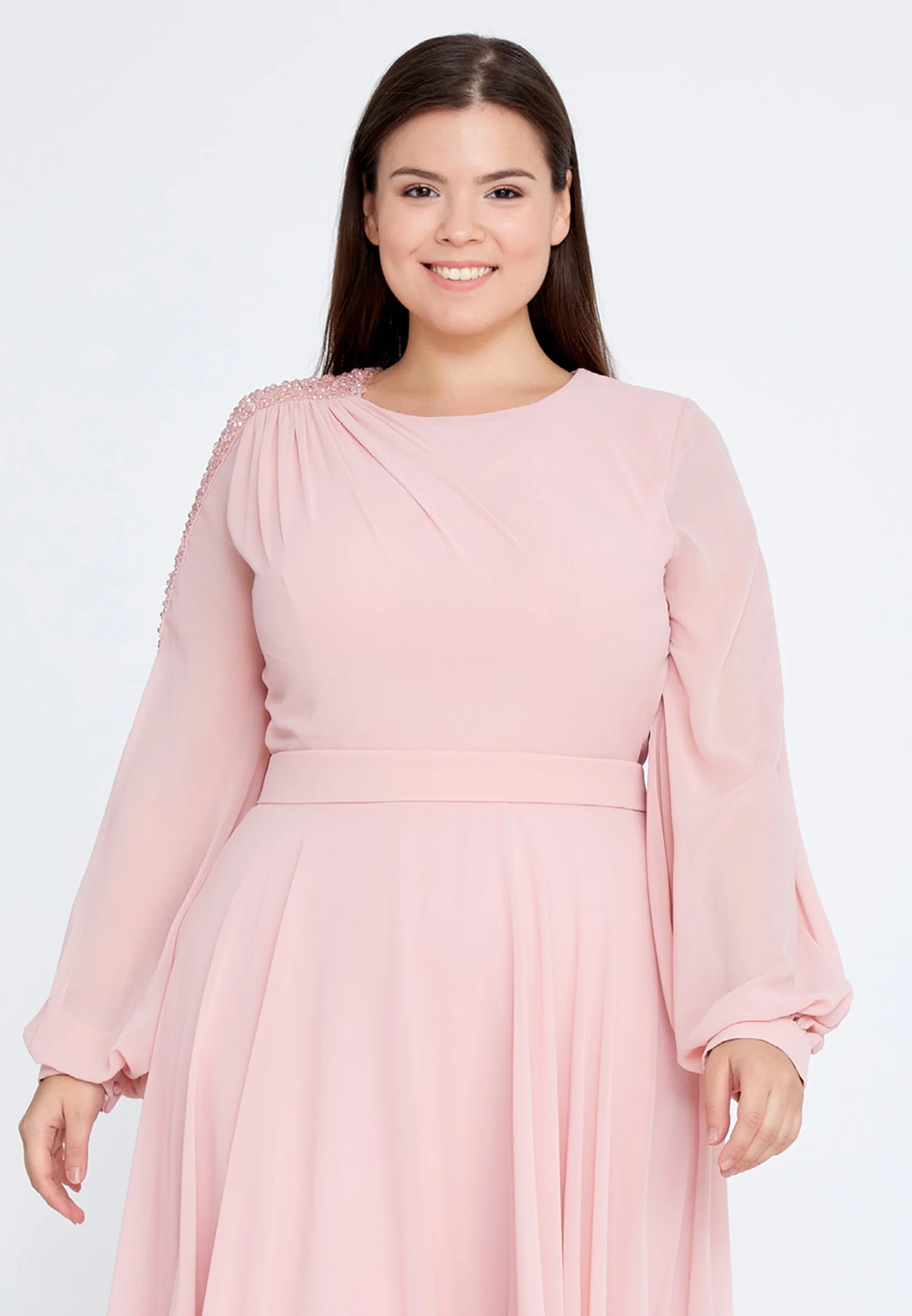 Long Sleeve Maxi Chiffon Column Plus Size Evening Dress SEE5298-B