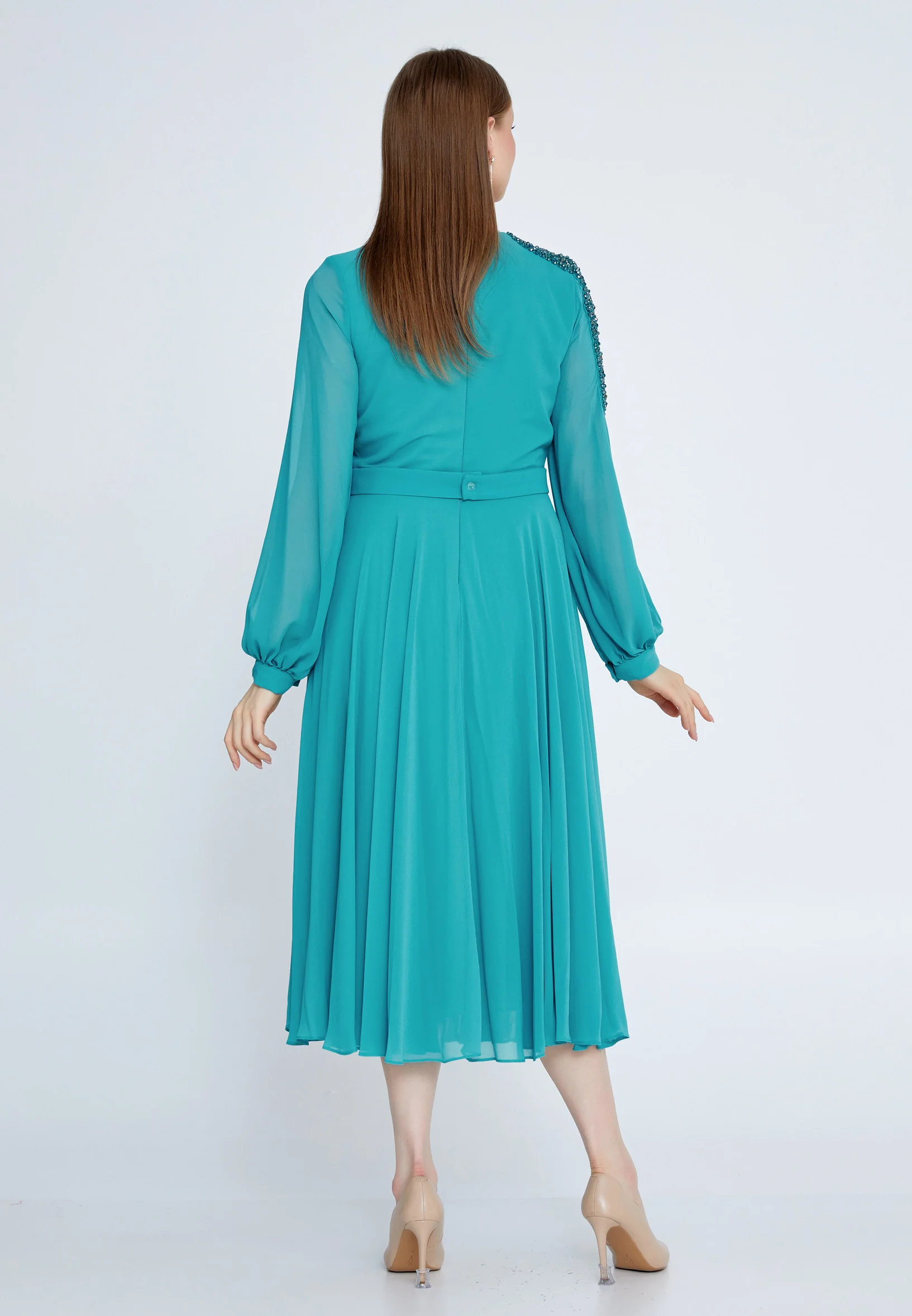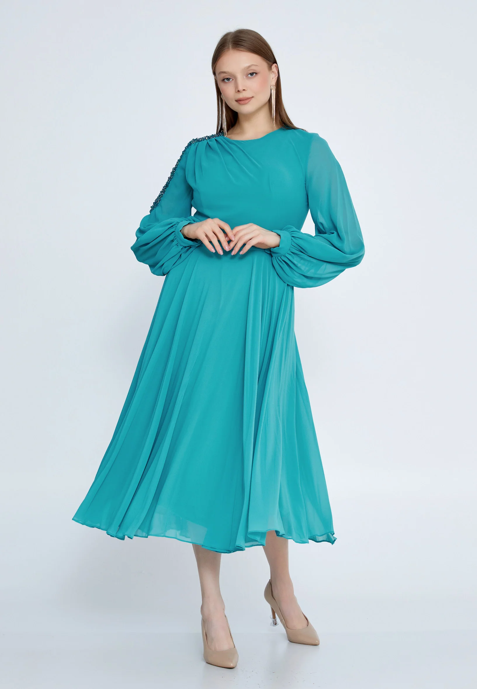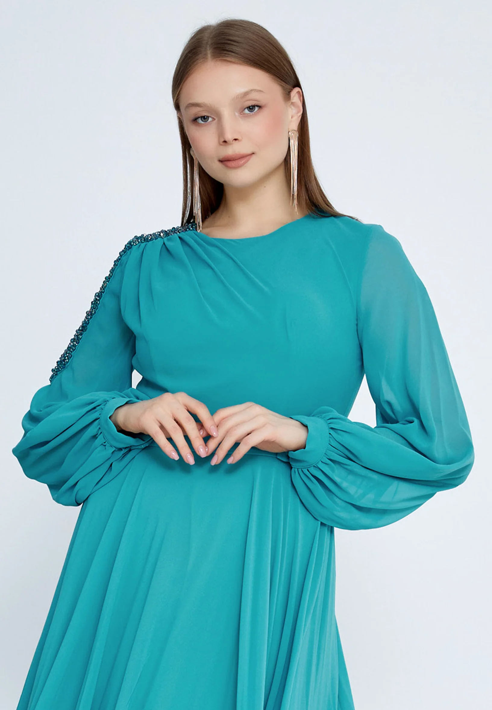 Long Sleeve Maxi Chiffon Column Plus Size Evening Dress SEE5298-B
